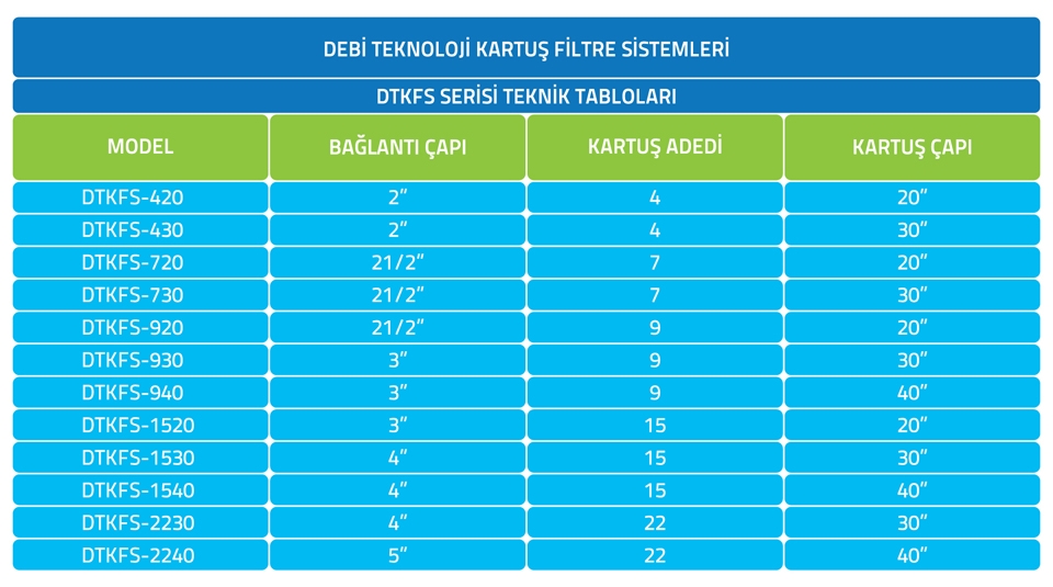 Debi Kartuş Filtre Sistemleri, filtre gövdesi ve kartuşlardan oluşmaktadır.Filtre gövdesi suyu arıtacak ana eleman olan kartuşlara yuvalık görevi yapar. Filtre gövdeleri paslanmaz çelik veya karbon çelik malzemelerden imal edilebilir. Kartuş Filtre Sistemlerinde kullanılan kartuşlar değişik mikron hassasiyetlerine sahiptir.Bu nedenle değişik kapasiteler için uygun hassasiyette uygun sayıda ve uygun özellikteki kartuşlar ile mikron mertebesinde hassas filtrasyon yapmak mümkündür. Filtreye giren ham suyun özellikleri, filtrelerin kullanım süresi ve kartuşların kirlenme sürelerini etkileyen kriterlerdir.Kirlenen kartuşlar filtrenin basınç kaybını arttıracağı gibi filtreleme hassasiyetini de azaltacağı için değiştirilmelidir.